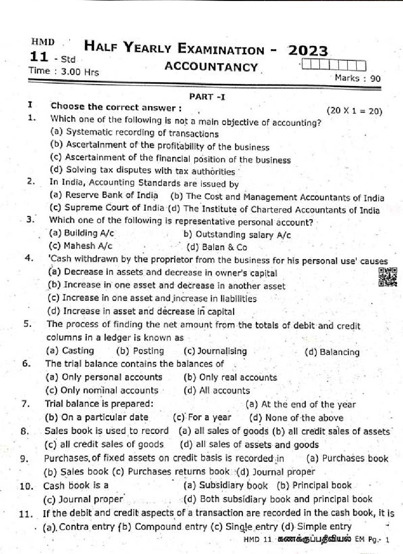 There are more tests besides Accountancy in half yearly exams. Here are all the subject-wise question papers of TN Board class 11th half yearly exams at aglasem.com.