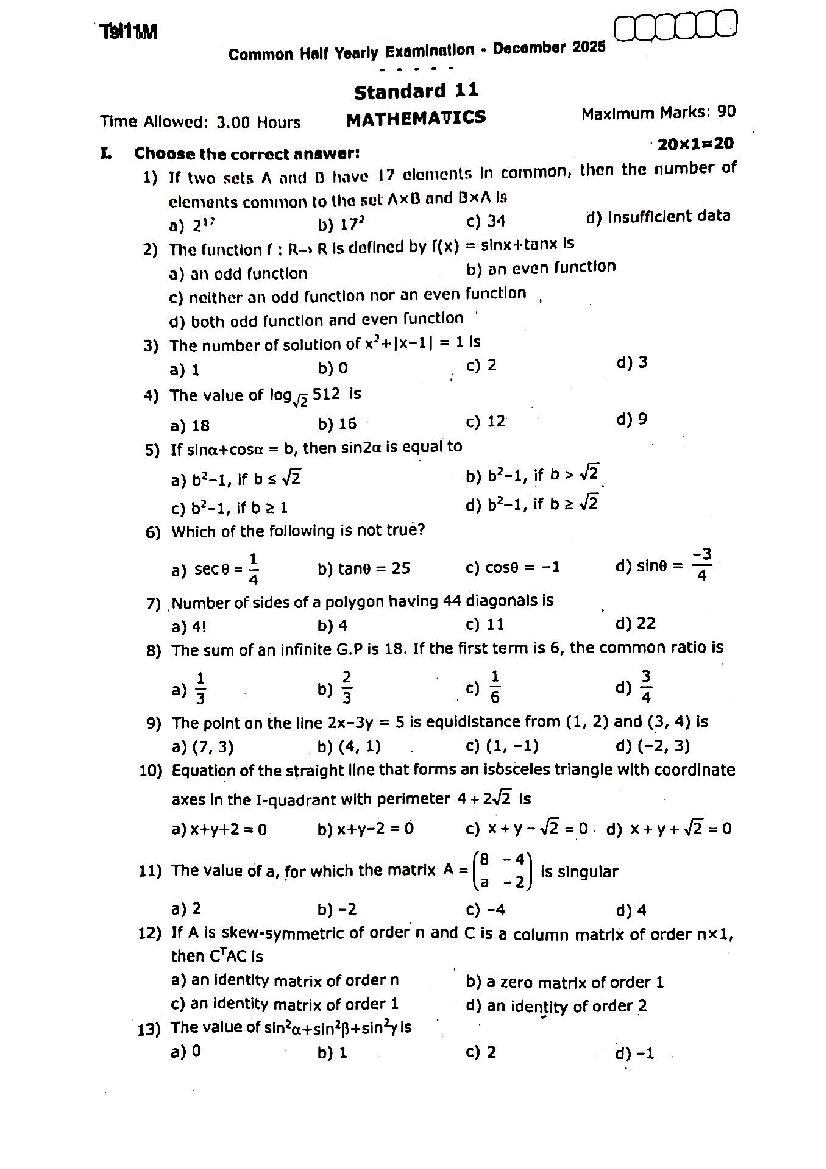 TN Class 11 Half Yearly Exam Question Paper 2025 Mathematics View Download