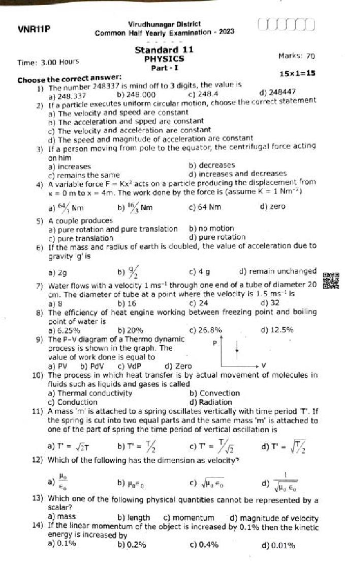 TN Class 11 Half Yearly Exam Question Paper 2023-24 Physics View Download
