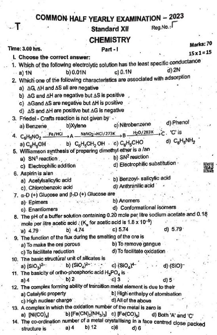 TN Class 12 Half Yearly Exam Question Paper 2023-24 Chemistry View Download