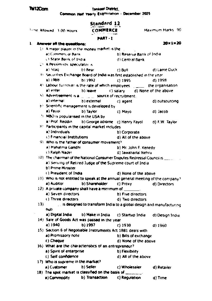 The Commerce question paper for Tamil Nadu board standard 12th half yearly examinations is given below.