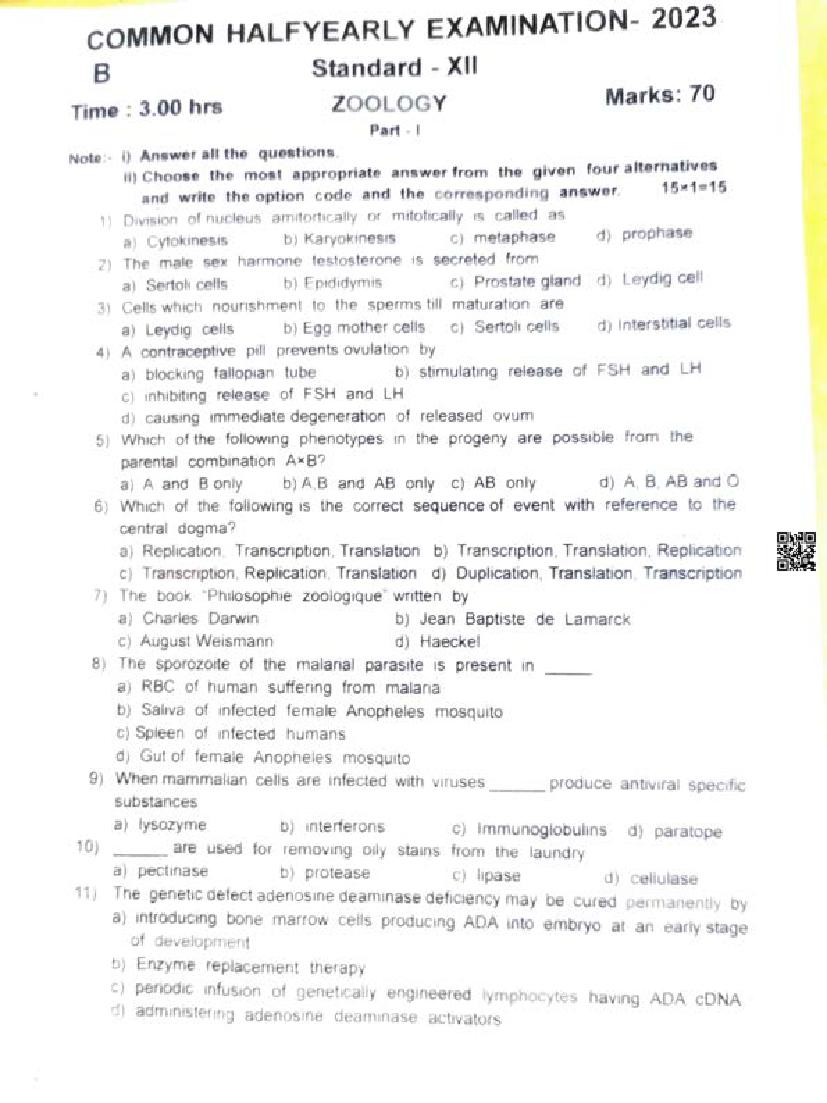 There are more tests besides Zoology in half yearly exams. Here are all the subject-wise question papers of TN Board class 12th half yearly exams at aglasem.com.
