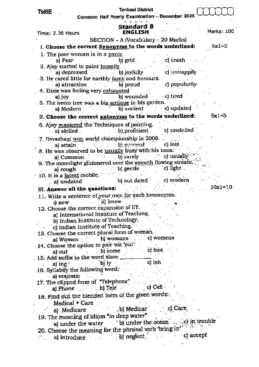 - TN 8th Standard Half Yearly Exam Question Paper