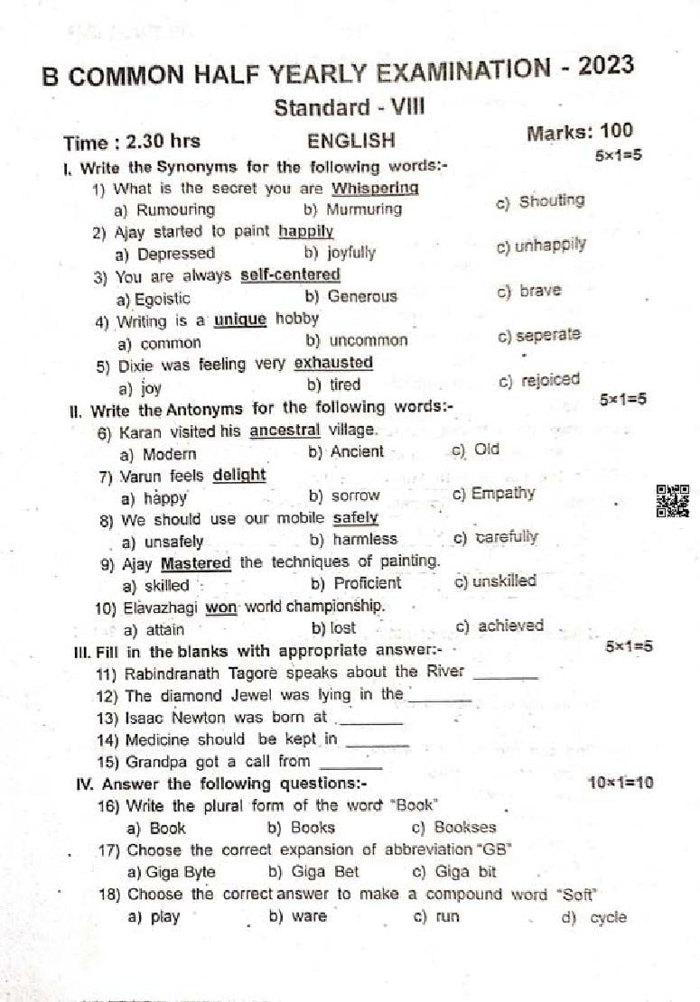 TN 8th English Half Yearly Question Paper 2023-24 PDF Download Link – Click Here to Download Question Paper PDF