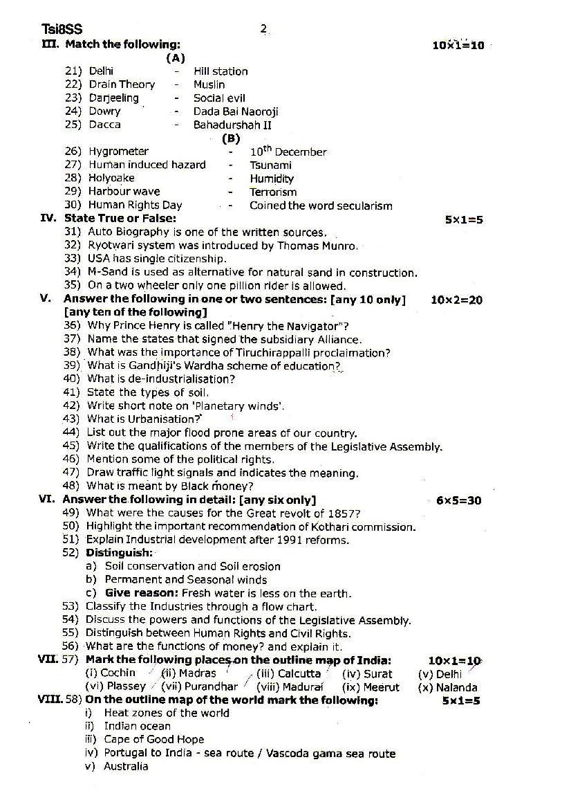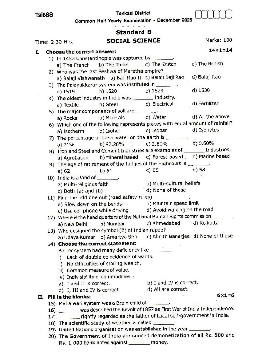 The Social Science question paper for Tamil Nadu board standard 8th half yearly examinations is given below.