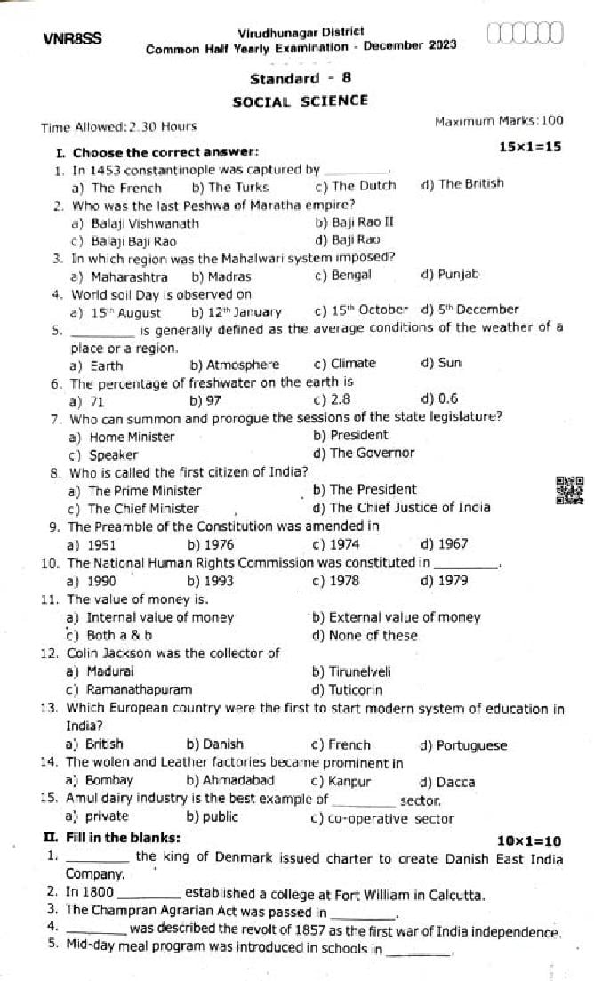 TN 8th Social Science Half Yearly Question Paper 2023-24 PDF Download Link – Click Here to Download Question Paper PDF
