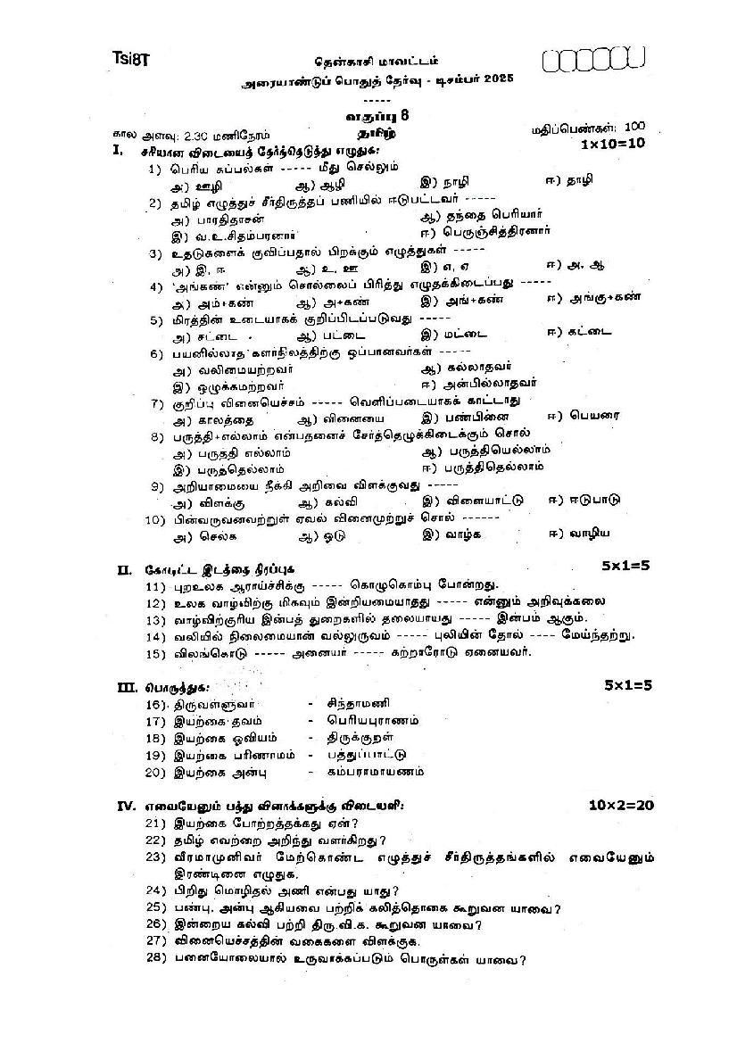 TN Class 8 Half Yearly Exam Question Paper 2025 Tamil View Download