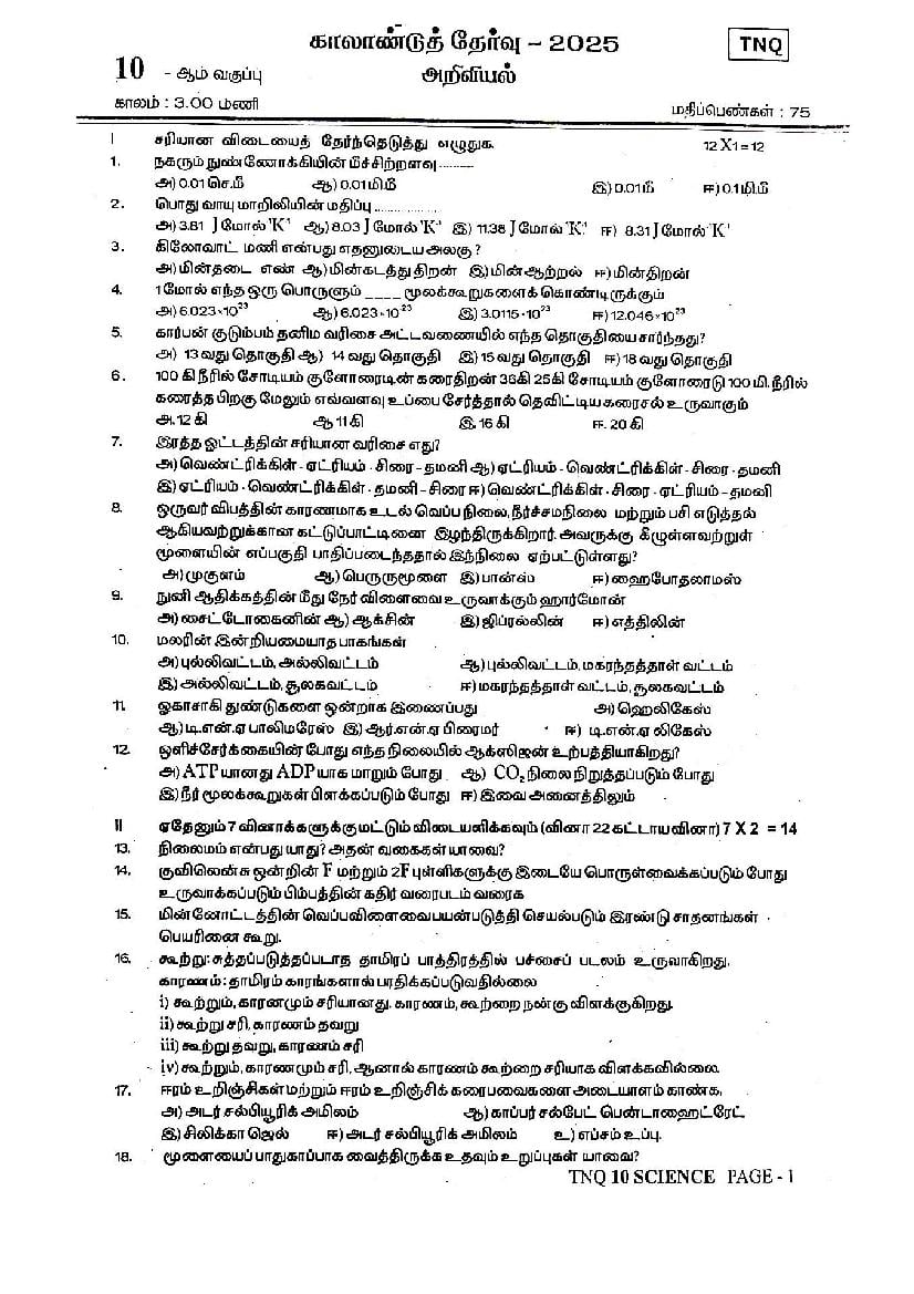 TN Class 10 Quarterly Exam Question Paper 2025 Science View Download