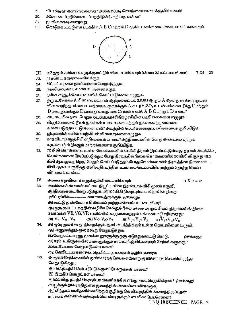 The TN Board question paper for quarterly exam of 10th standard Science subject is as follows.