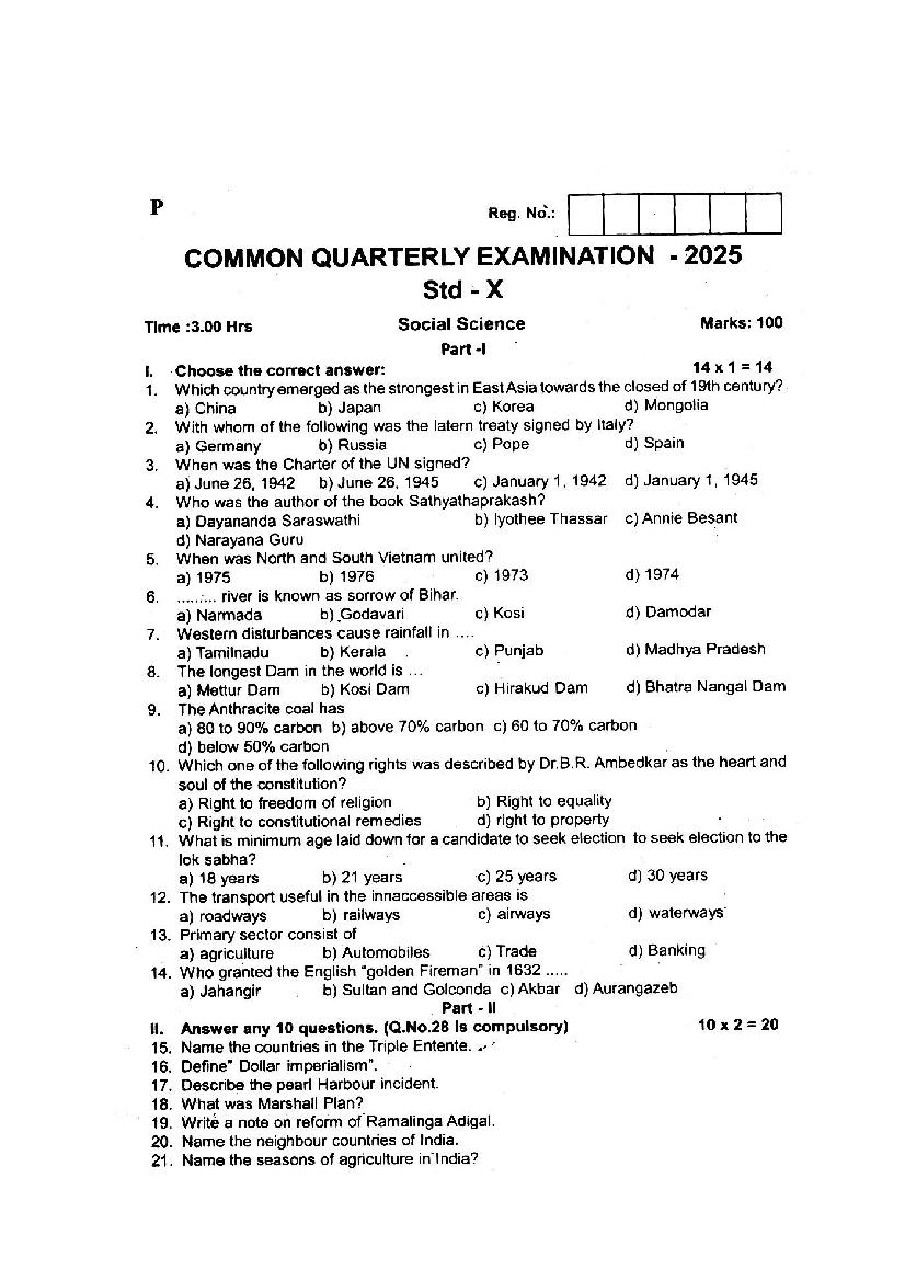 | Paper Here | 10th Quarterly Exam Question Paper of Social Science |