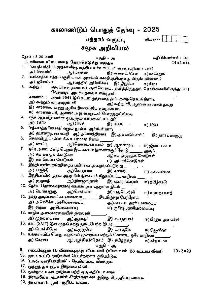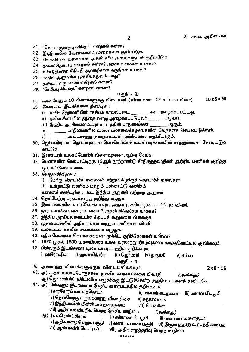 The TN Board question paper for quarterly exam of 10th standard Social Science subject is as follows.