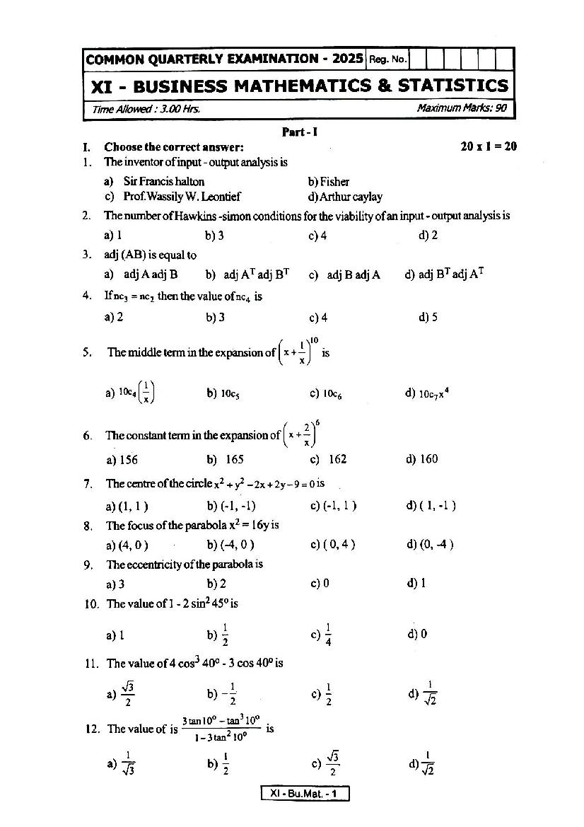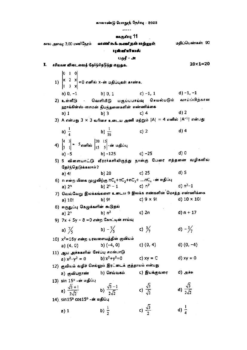 TN 11th Business Maths Quarterly Exam Question Paper 2025 – Click Here to Download Question Paper