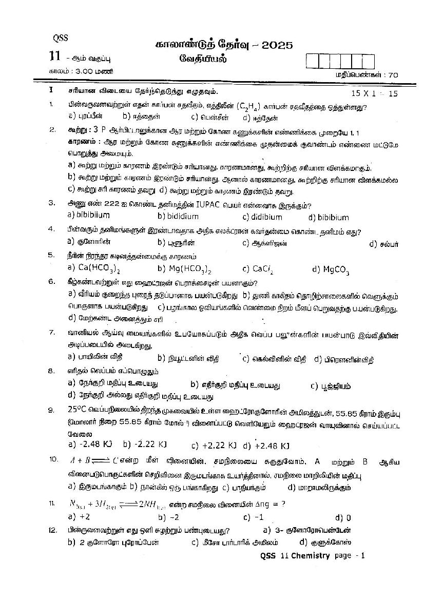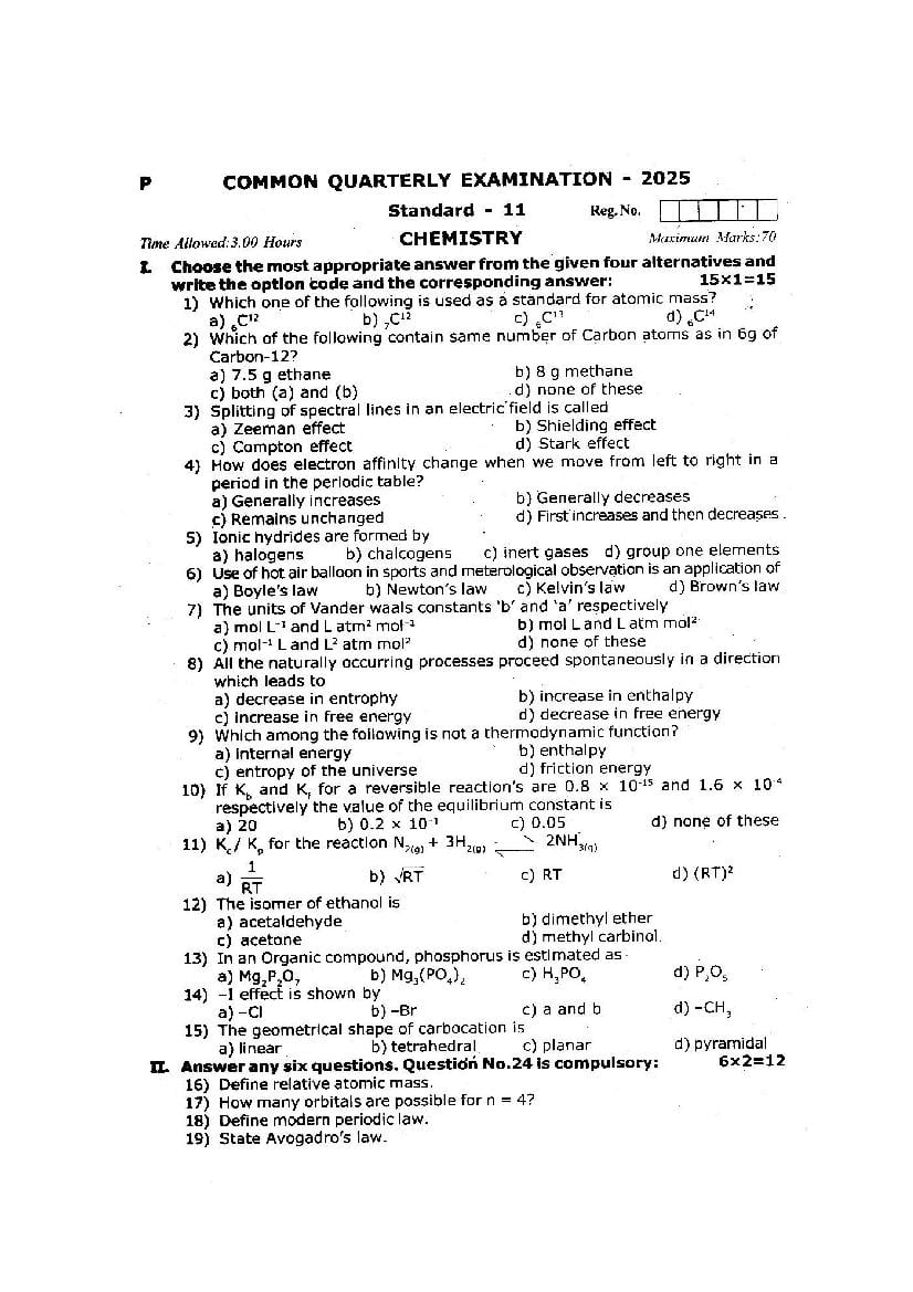 TN Class 11 Quarterly Exam Question Paper 2025 Chemistry View Download