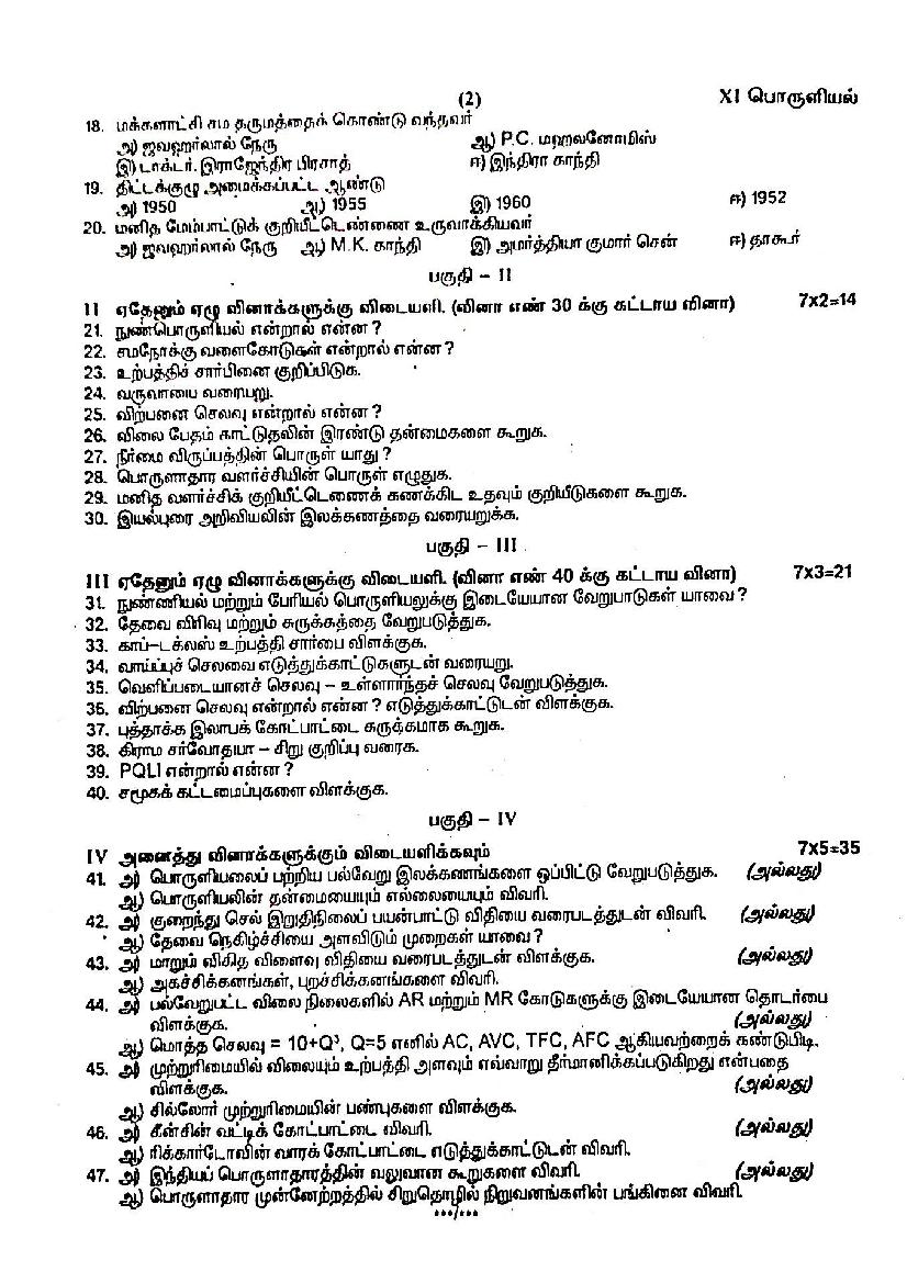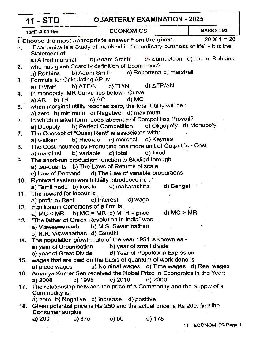 The TN Board question paper for quarterly exam of 11th standard Economics subject is as follows.