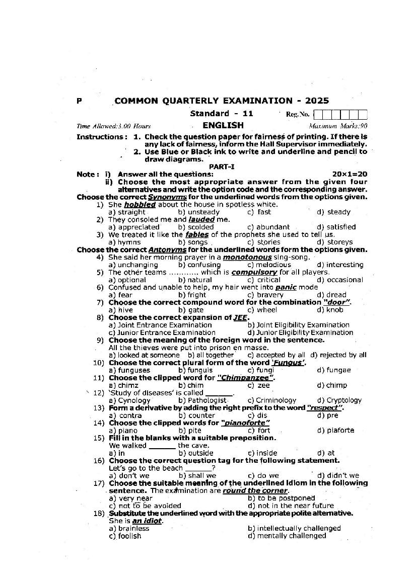 TN Class 11 Quarterly Exam Question Paper 2025 English View Download