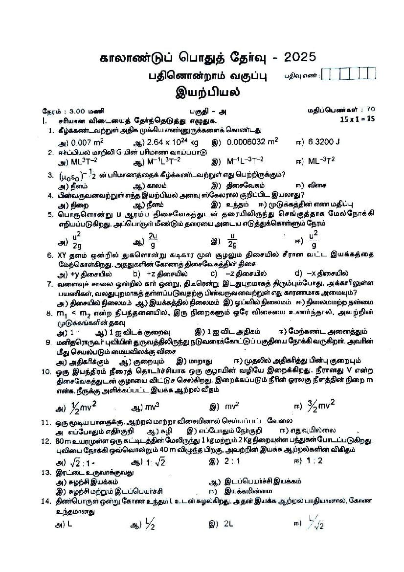 TN Class 11 Quarterly Exam Question Paper 2025 Physics View Download