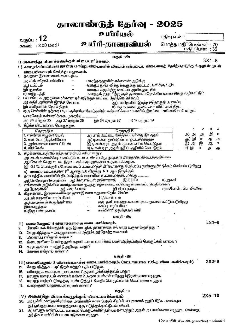TN Class 12 Quarterly Exam Question Paper 2025 Biology View Download