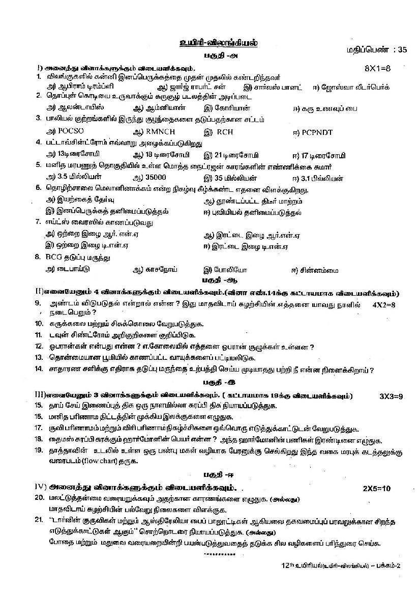 The TN Board question paper for quarterly exam of 12th standard Biology subject is as follows.
