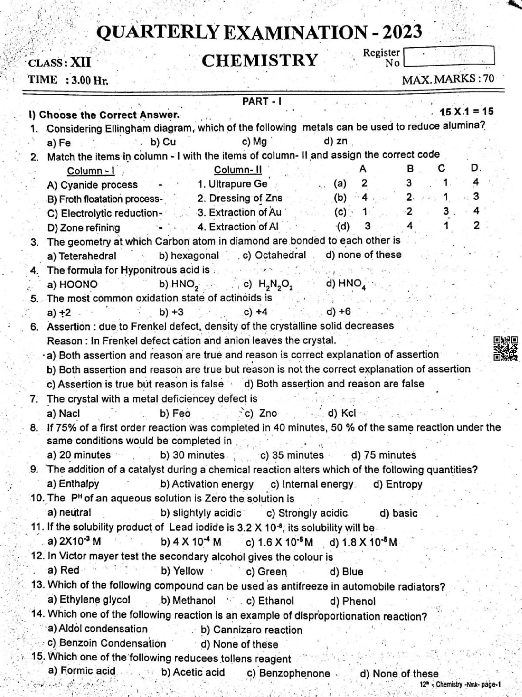 | Paper Here | 12th Quarterly Exam Question Paper of Chemistry |