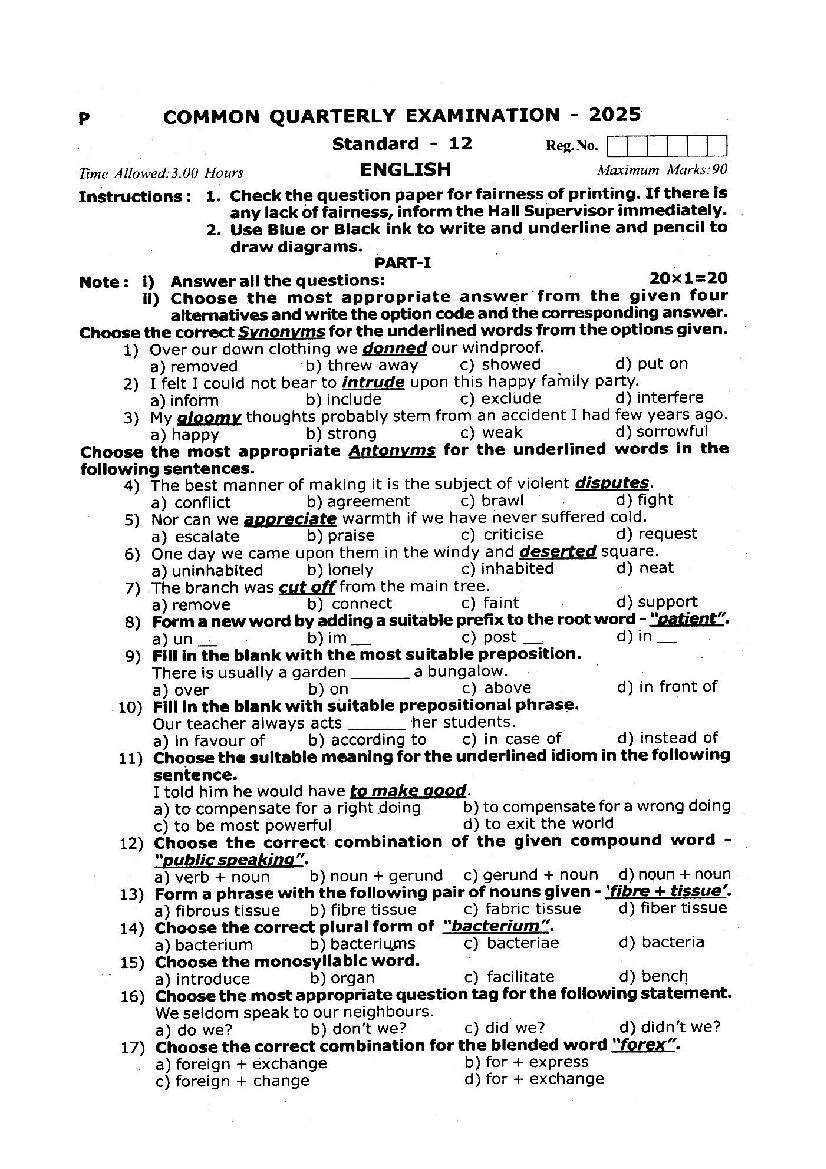 TN Class 12 Quarterly Exam Question Paper 2025 English View Download