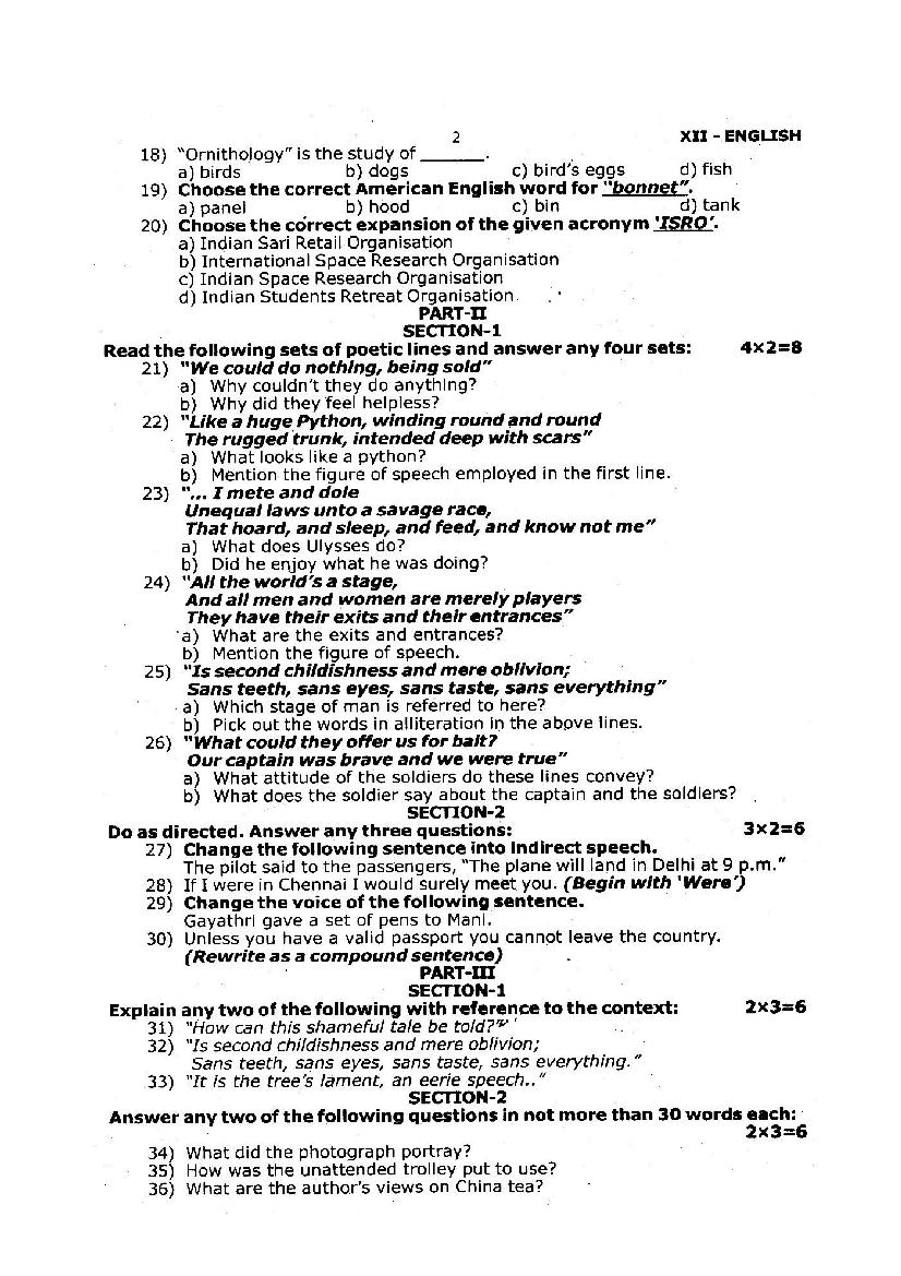 The TN Board question paper for quarterly exam of 12th standard English subject is as follows.