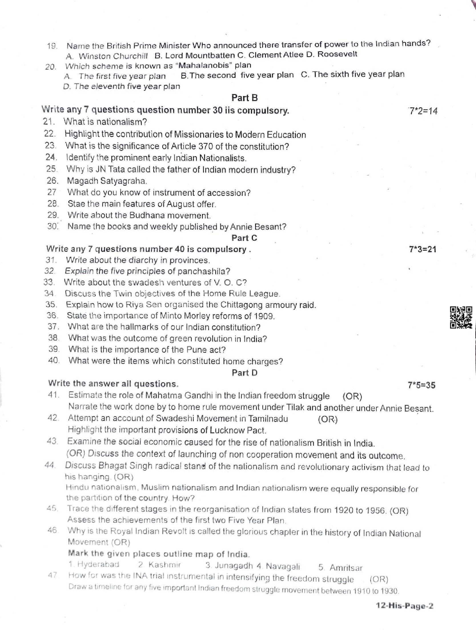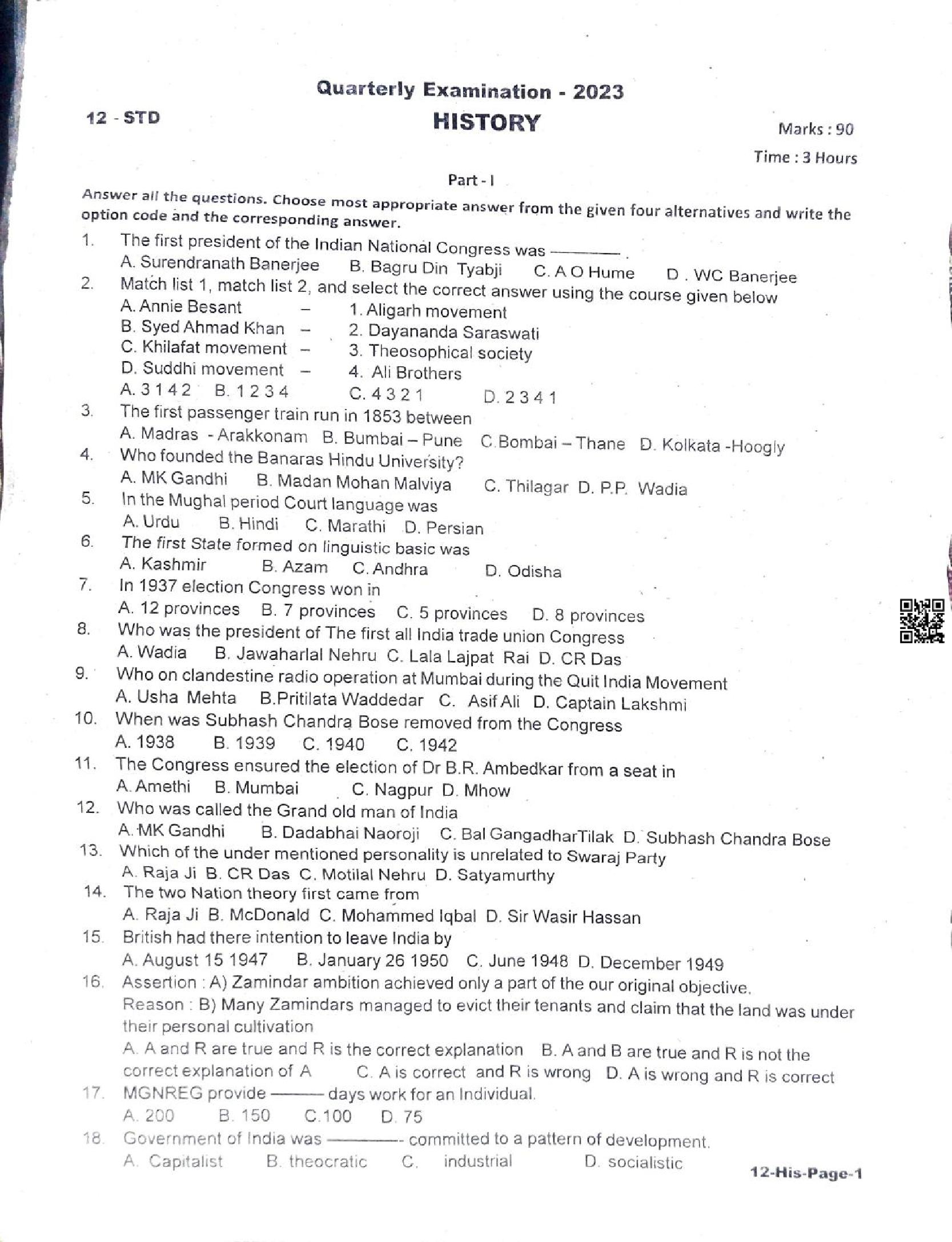 | Paper Here | 12th Quarterly Exam Question Paper of History |