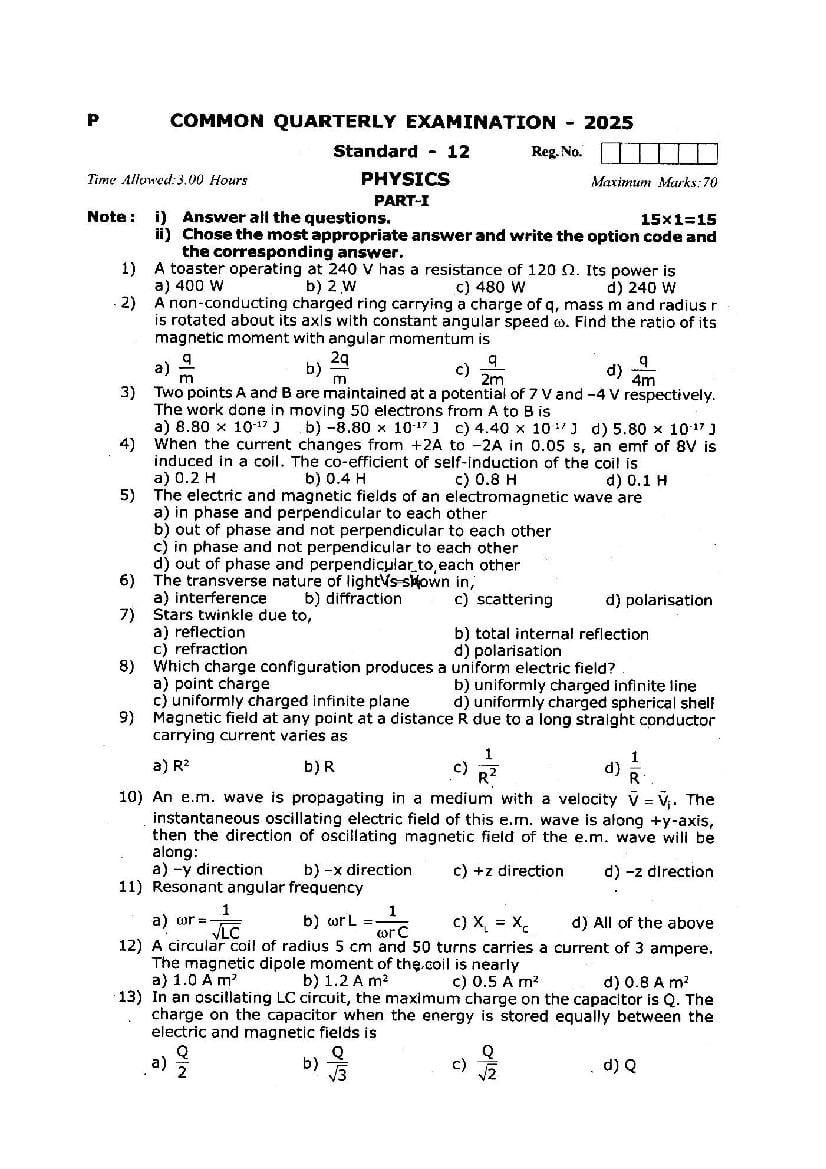 The TN Board question paper for quarterly exam of 12th standard Physics subject is as follows.