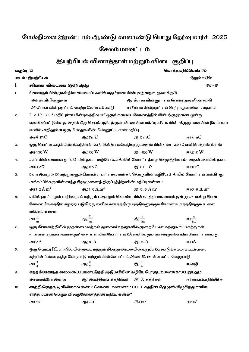 TN Class 12 Quarterly Exam Question Paper 2025 Physics View Download