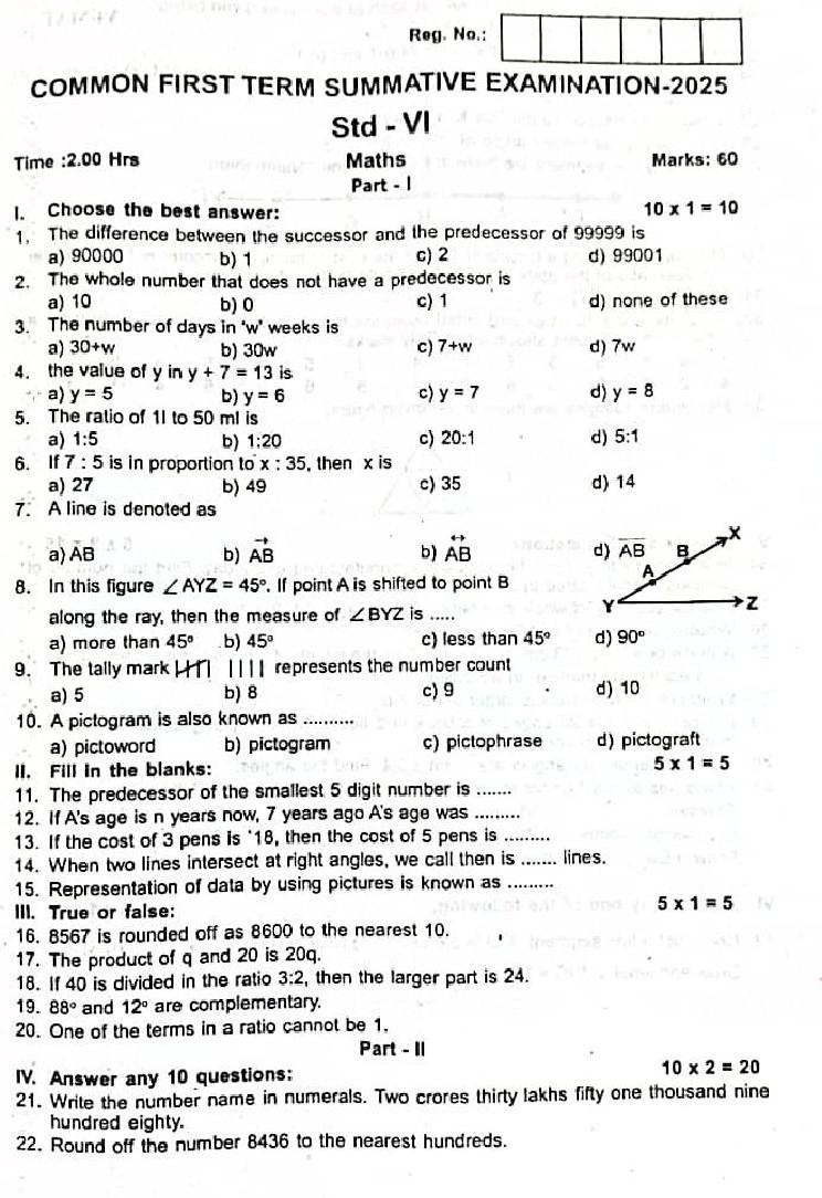 The TN Board question paper for quarterly exam of 6th standard Maths subject is as follows.