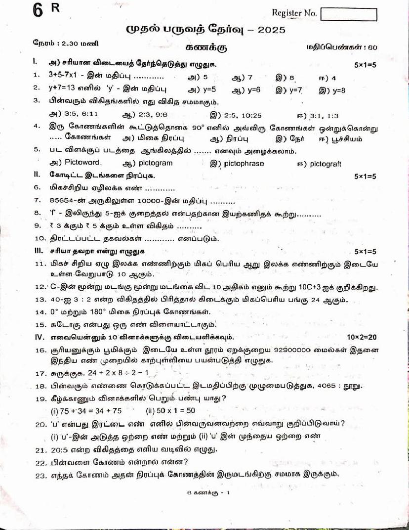 TN Class 6 Quarterly Exam Question Paper 2025 Maths View Download