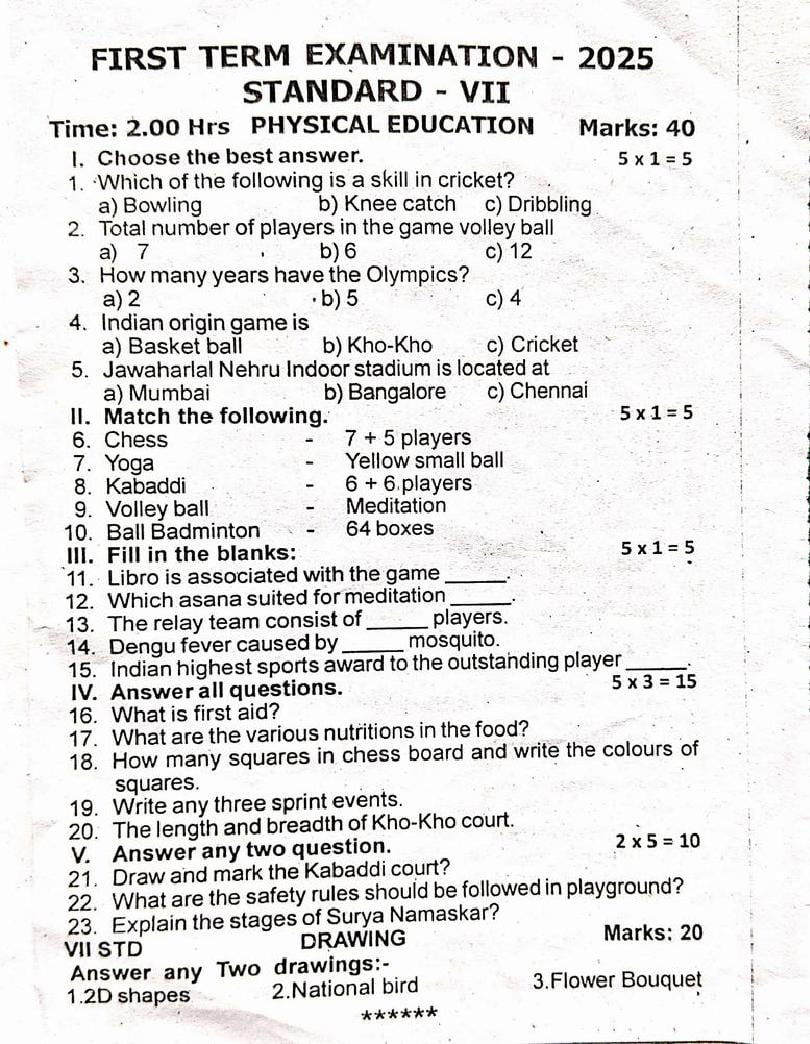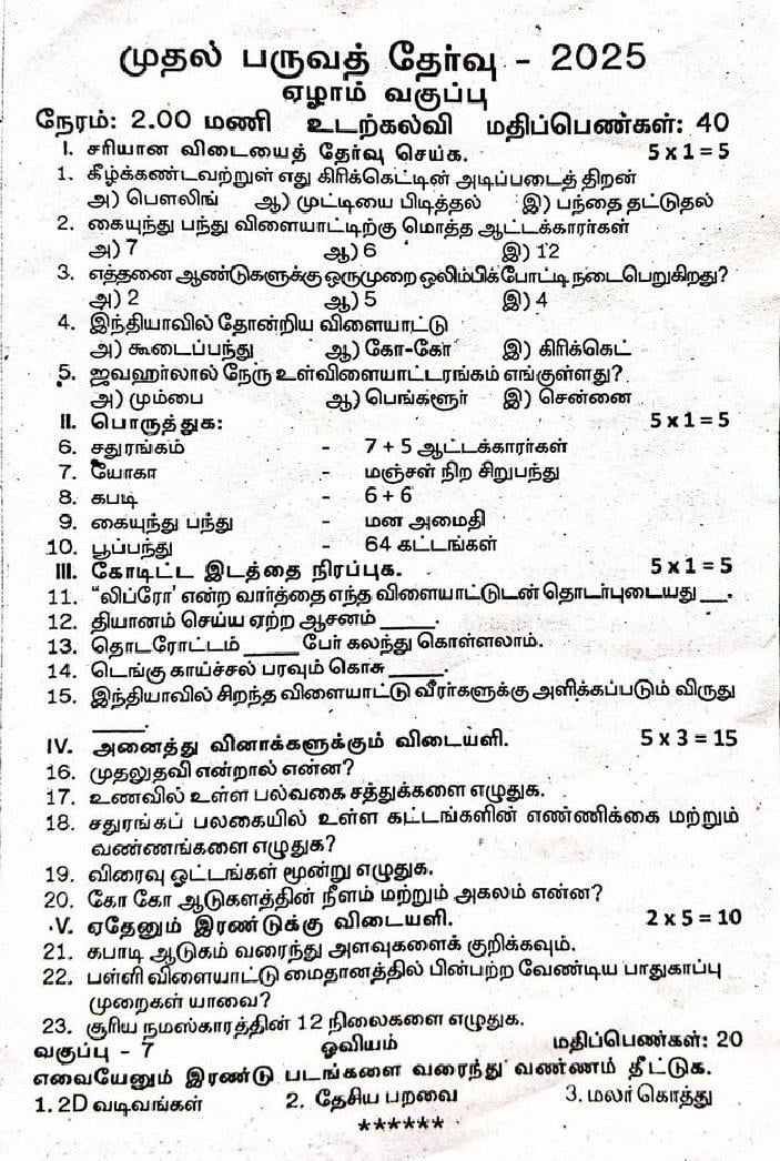 | Paper Here | 7th Quarterly Exam Question Paper of Physical Education |