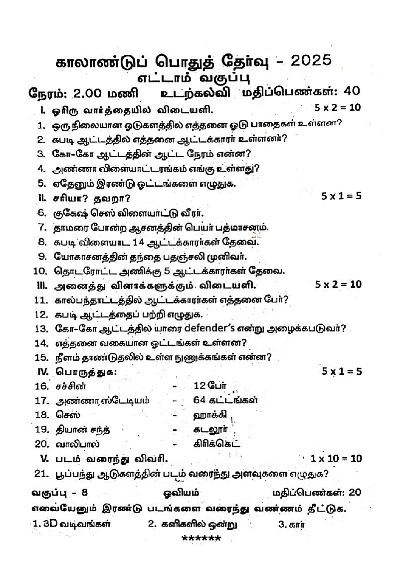 | Paper Here | 8th Quarterly Exam Question Paper of Physical Education |