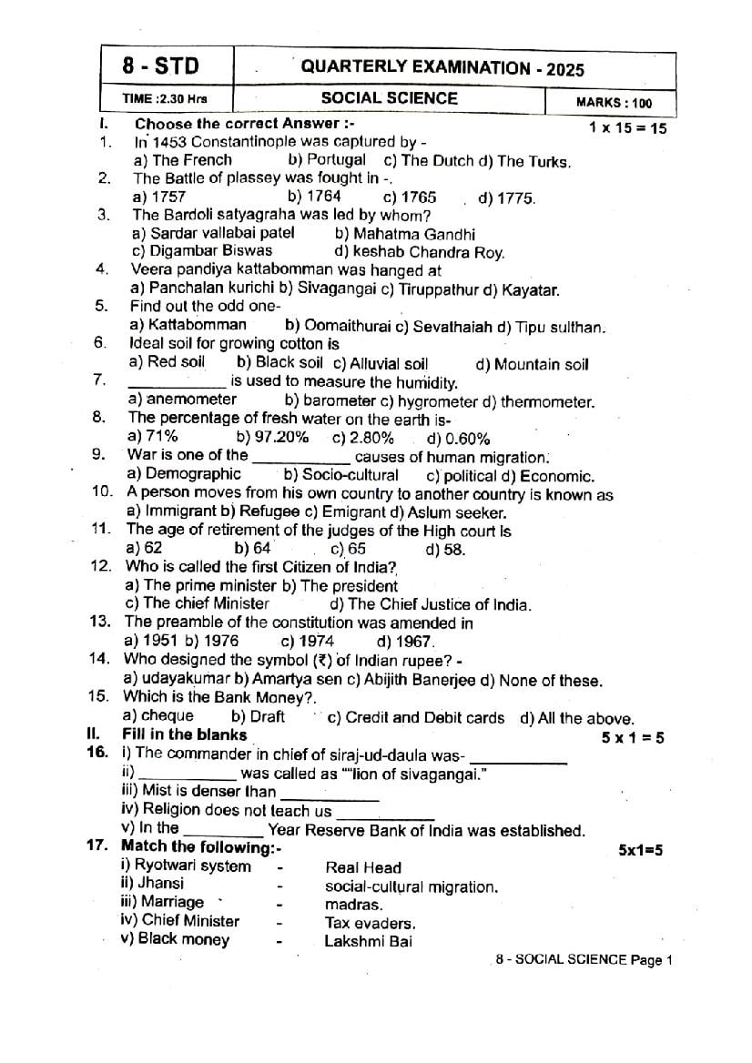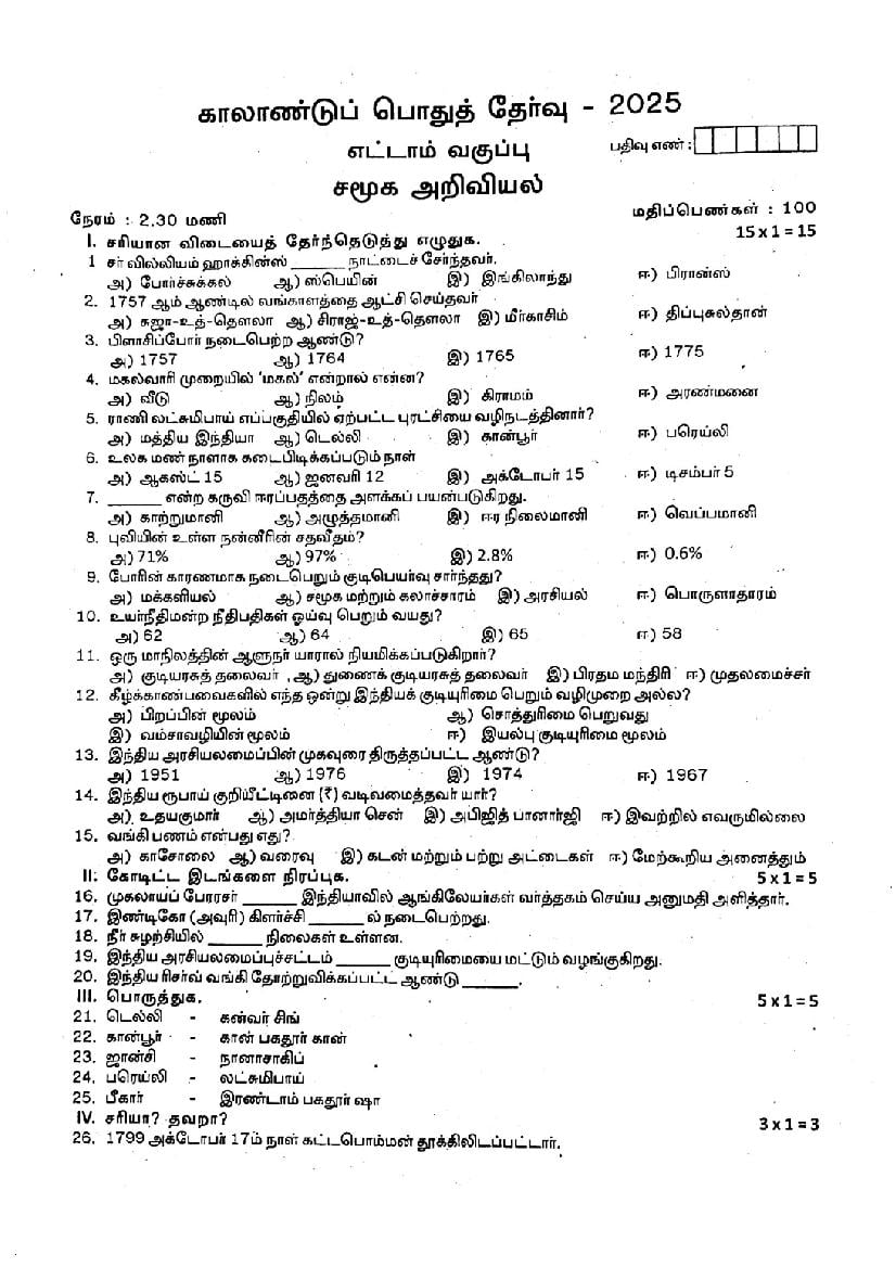 If you have queries on TN 8th Social Science Quarterly Exam Question Paper 2026, then please ask in comments below.