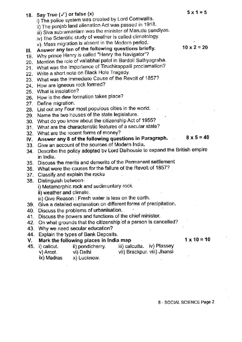 | Paper Here | 8th Quarterly Exam Question Paper of Social Science |