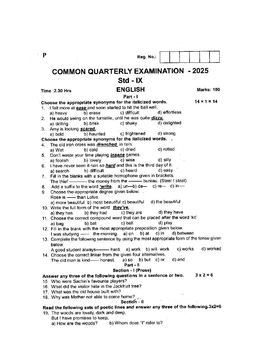 TN Class 9 Quarterly Exam Question Paper 2025 English View Download