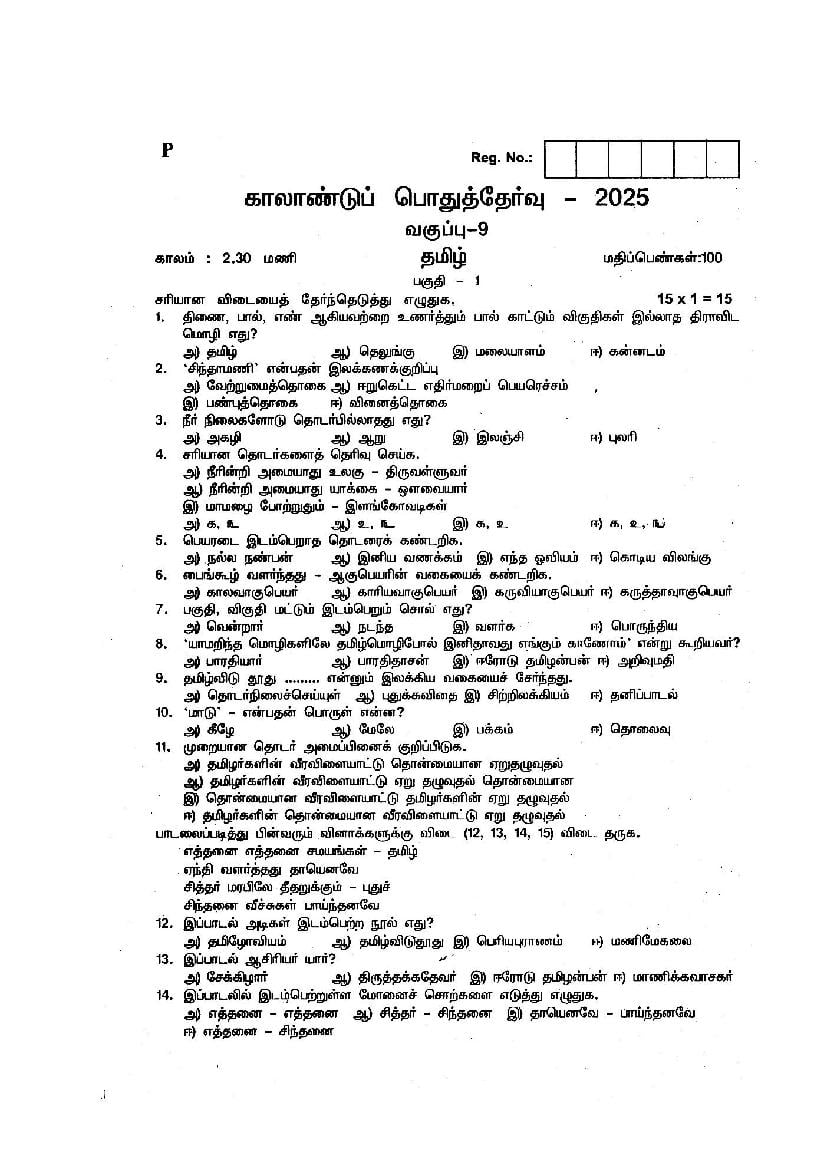 TN Class 9 Quarterly Exam Question Paper 2025 Tamil View Download