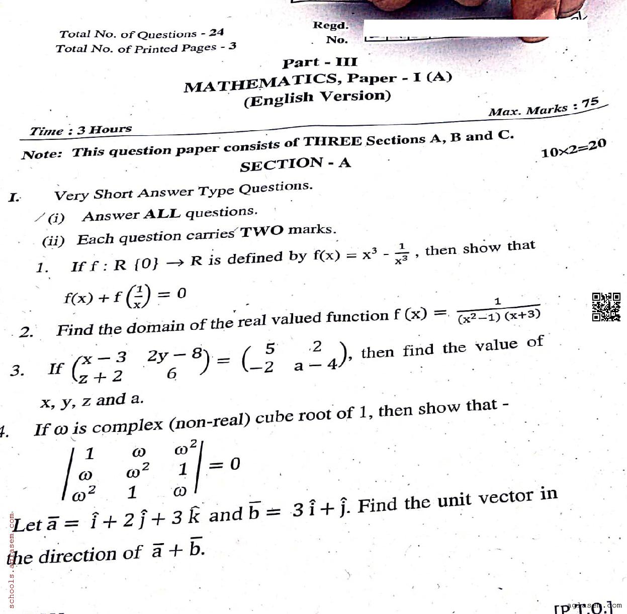 Telangana Inter 1st Year Maths 1A Question Paper 2024