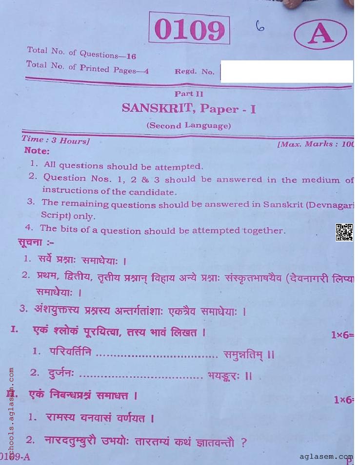 | Study Material Here | Telangana Board Question Paper of Class 11 Sanskrit |