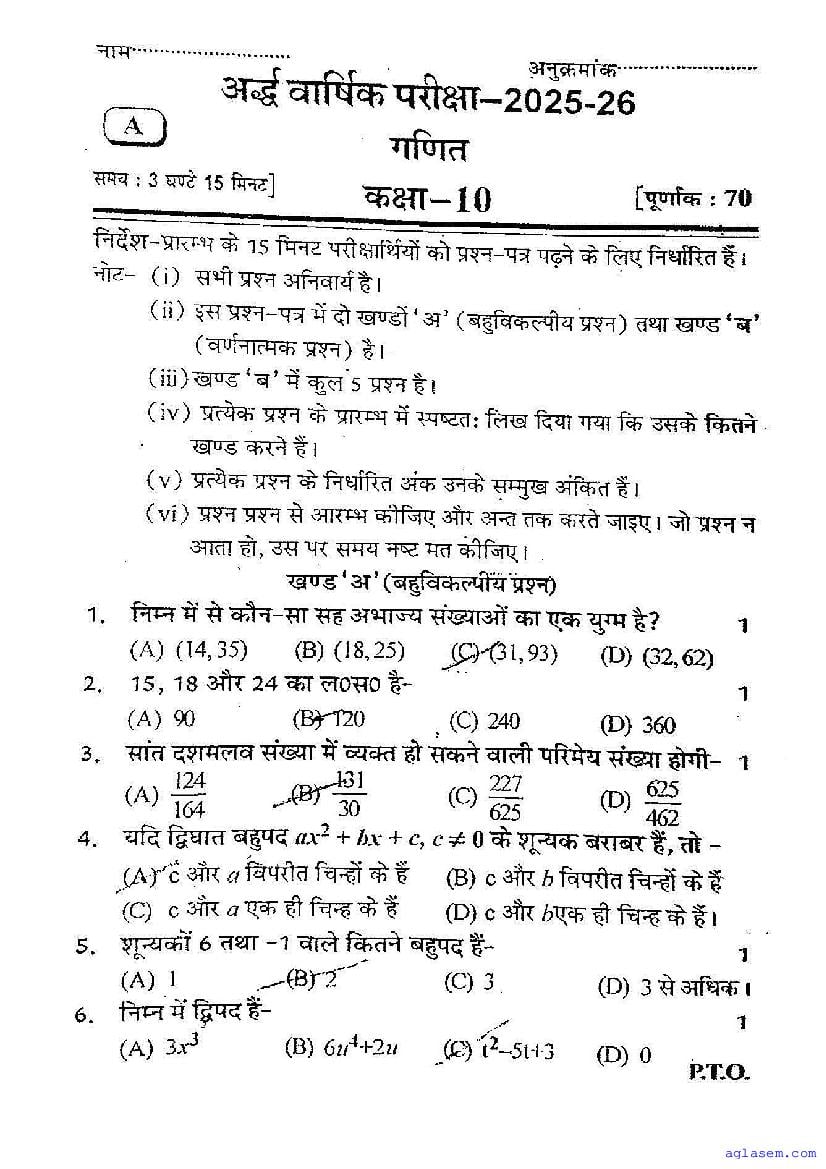 UP Board Class 10 Maths Half-Yearly Question Paper 2026 is published here after mid exam. You can download the UP Board Class 10 Maths Previous Year Half Yearly Question Paper PDF from here on aglasem to practice for your upcoming paper. It contains actual questions asked in the past year half yearly Maths exam. This UP Board Class 10 Question Paper for Half yearly examination is for the Maths subject and helps you understand exam difficulty level, types of questions to expect in exams. Therefore by practicing the Maths half yearly exam question paper, you can improve your preparation for the 10th standard exams and aim to score full marks in Maths.