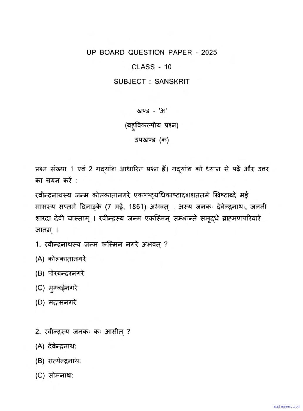 UP Board Class 10 Sanskrit Question Paper 2026 is published after exam. You can download the UP Board Class 10 Sanskrit Previous Year Question Paper PDF from here on aglasem to practice for your upcoming paper. It contains actual questions asked in the past year Sanskrit exam. This UP Board Class 10 Question Paper is for the Sanskrit subject and helps you understand exam difficulty level, types of questions to expect in exams. Therefore by practising the Sanskrit question paper, you can improve your preparation for the 10th standard exams and aim to score full marks in Sanskrit.