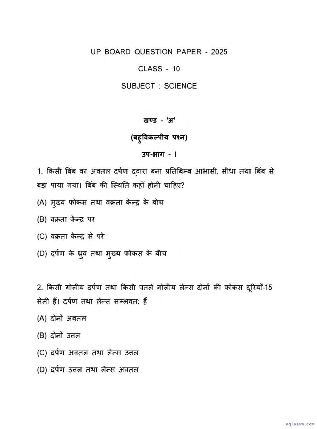 UP Board Class 10 Science Question Paper 2026 is published after exam. You can download the UP Board Class 10 Science Previous Year Question Paper PDF from here on aglasem to practice for your upcoming paper. It contains actual questions asked in the past year Science exam. This UP Board Class 10 Question Paper is for the Science subject and helps you understand exam difficulty level, types of questions to expect in exams. Therefore by practising the Science question paper, you can improve your preparation for the 10th standard exams and aim to score full marks in Science.