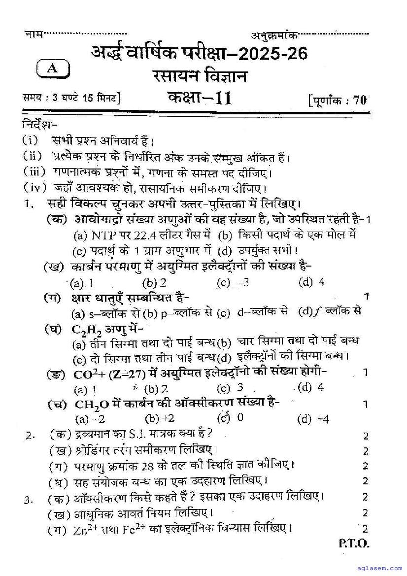 UP Board Class 11 Half Yearly Exam Question Paper 2025 Chemistry View Download