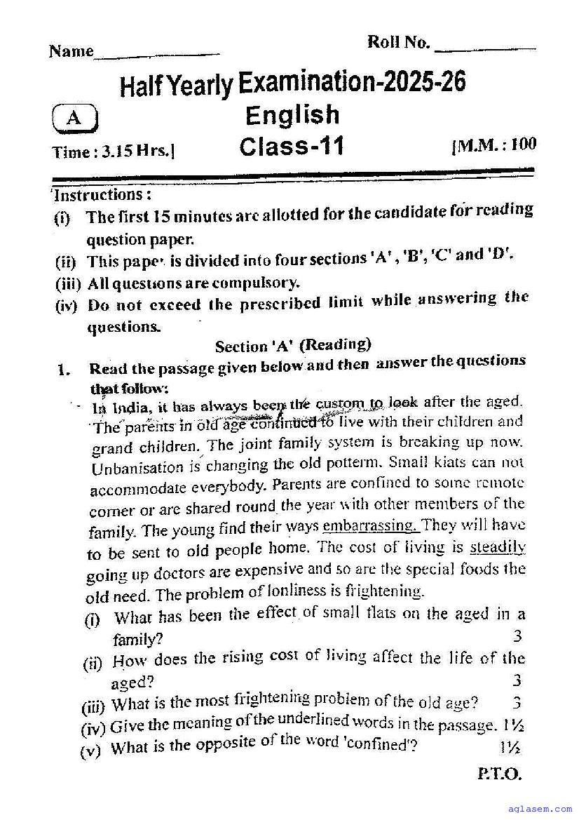 UP Board Class 11 English Half-Yearly Question Paper 2026 is published here after mid exam. You can download the UP Board Class 11 English Previous Year Half Yearly Question Paper PDF from here on aglasem to practice for your upcoming paper. It contains actual questions asked in the past year half yearly English exam. This UP Board Class 11 Question Paper for Half yearly examination is for the English subject and helps you understand exam difficulty level, types of questions to expect in exams. Therefore by practicing the English half yearly exam question paper, you can improve your preparation for the 11th standard exams and aim to score full marks in English.