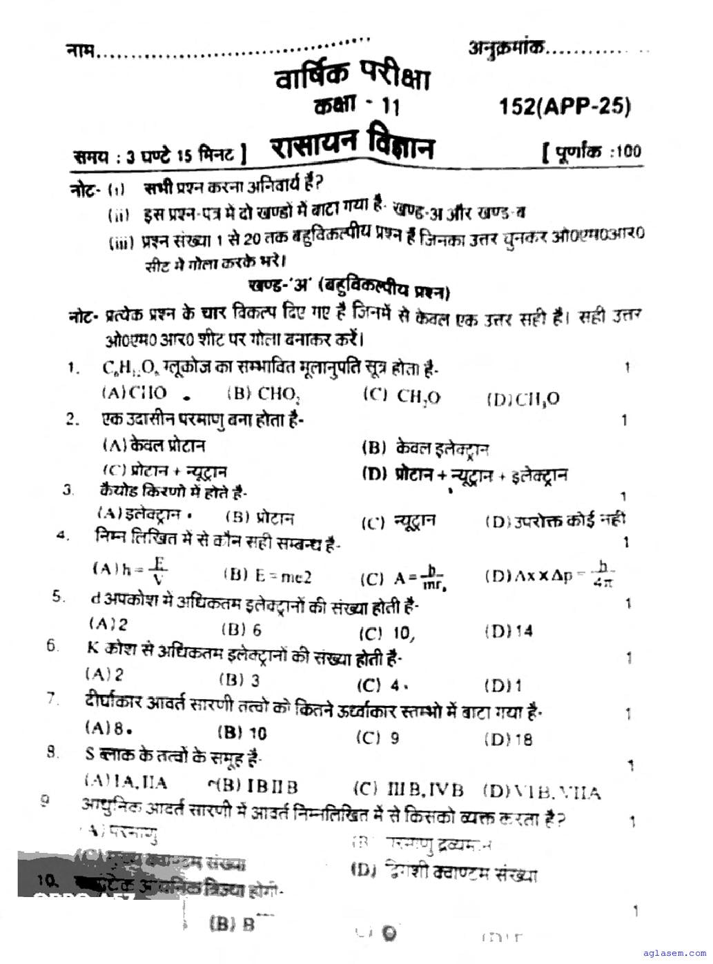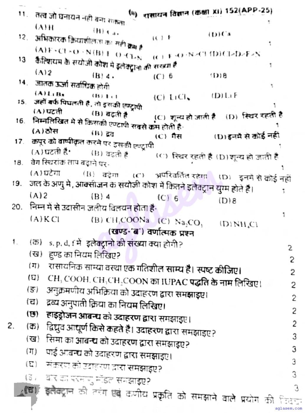 UP Board Class 11 Chemistry Question Paper 2026 is published after exam. You can download the UP Board Class 11 Chemistry Previous Year Question Paper PDF from here on aglasem to practice for your upcoming paper. It contains actual questions asked in the past year Chemistry exam. This UP Board Class 11 Question Paper is for the Chemistry subject and helps you understand exam difficulty level, types of questions to expect in exams. Therefore by practising the Chemistry question paper, you can improve your preparation for the 11th standard exams and aim to score full marks in Chemistry.
