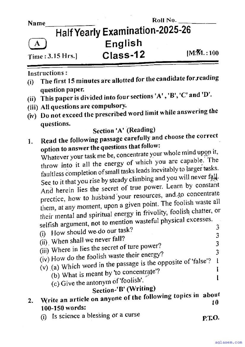 UP Board Class 12 English half yearly Question Paper 2025-26 PDF – Click Here to Download Question Paper PDF