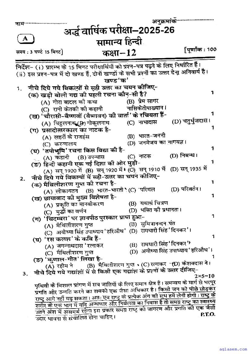 UP Board Class 12 Hindi Half-Yearly Question Paper 2026 is published here after mid exam. You can download the UP Board Class 12 Hindi Previous Year Half Yearly Question Paper PDF from here on aglasem to practice for your upcoming paper. It contains actual questions asked in the past year half yearly Hindi exam. This UP Board Class 12 Question Paper for Half yearly examination is for the Hindi subject and helps you understand exam difficulty level, types of questions to expect in exams. Therefore by practicing the Hindi half yearly exam question paper, you can improve your preparation for the 12th standard exams and aim to score full marks in Hindi.