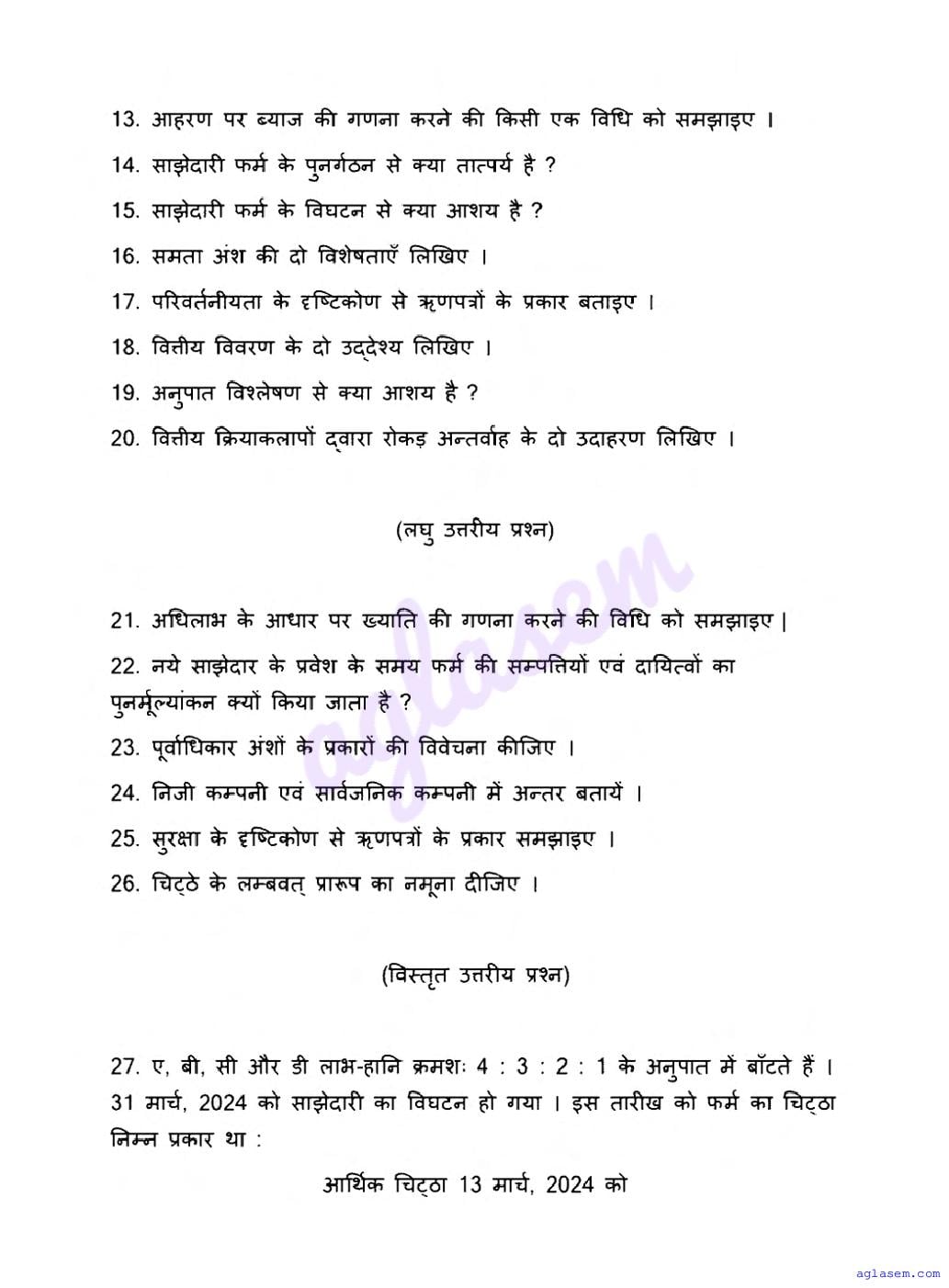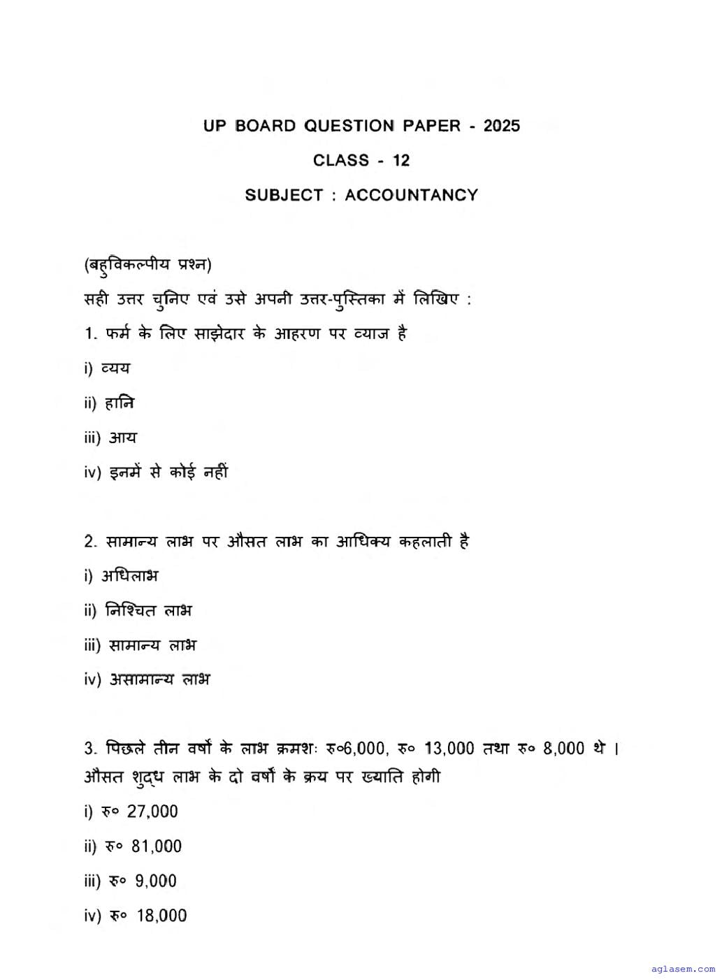 UP Board Class 12 Accountancy Question Paper 2026 is published after exam. You can download the UP Board Class 12 Accountancy Previous Year Question Paper PDF from here on aglasem to practice for your upcoming paper. It contains actual questions asked in the past year Accountancy exam. This UP Board Class 12 Question Paper is for the Accountancy subject and helps you understand exam difficulty level, types of questions to expect in exams. Therefore by practising the Accountancy question paper, you can improve your preparation for the 12th standard exams and aim to score full marks in Accountancy.