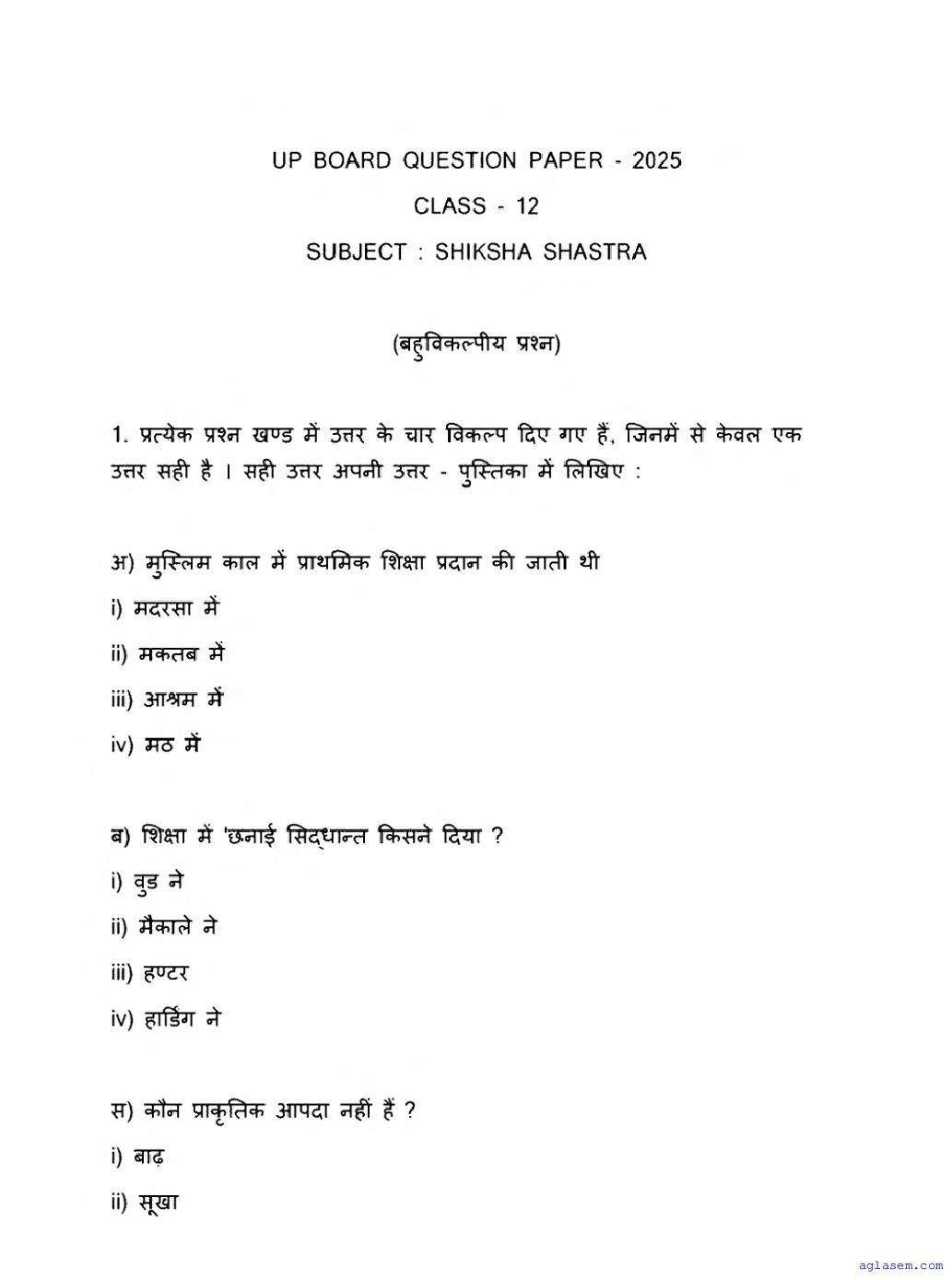 UP Board Class 12 Pedagogy Question Paper 2026 is published after exam. You can download the UP Board Class 12 Pedagogy Previous Year Question Paper PDF from here on aglasem to practice for your upcoming paper. It contains actual questions asked in the past year Pedagogy exam. This UP Board Class 12 Question Paper is for the Pedagogy subject and helps you understand exam difficulty level, types of questions to expect in exams. Therefore by practising the Pedagogy question paper, you can improve your preparation for the 12th standard exams and aim to score full marks in Pedagogy.
