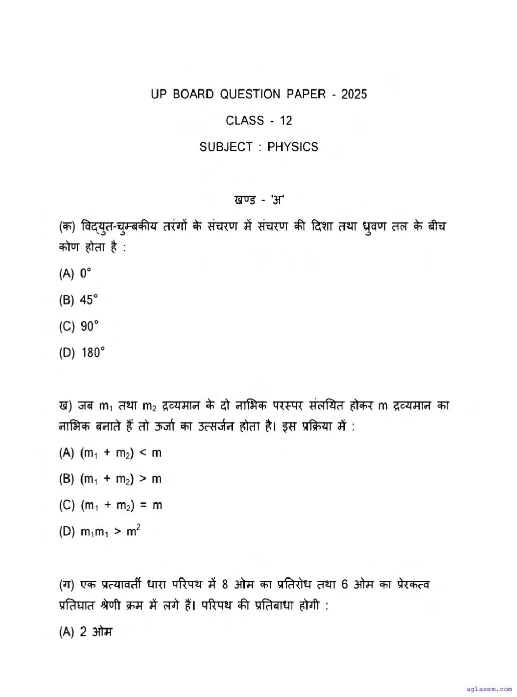 UP Board Class 12 Physics Question Paper 2026 is published after exam. You can download the UP Board Class 12 Physics Previous Year Question Paper PDF from here on aglasem to practice for your upcoming paper. It contains actual questions asked in the past year Physics exam. This UP Board Class 12 Question Paper is for the Physics subject and helps you understand exam difficulty level, types of questions to expect in exams. Therefore by practising the Physics question paper, you can improve your preparation for the 12th standard exams and aim to score full marks in Physics.