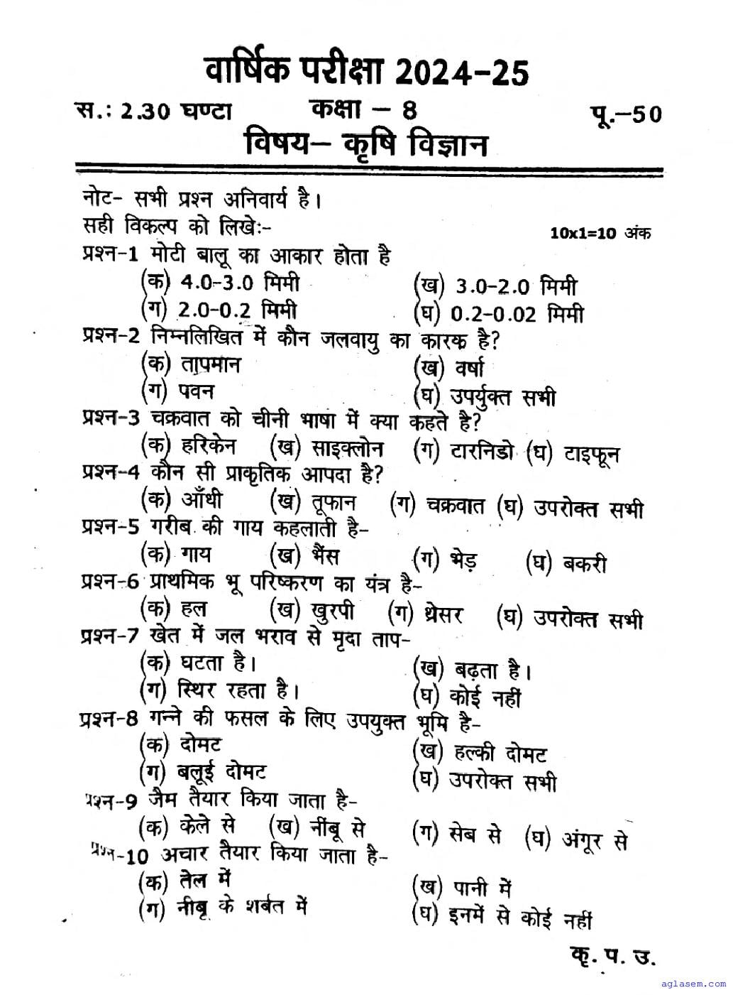 | Study Material Here | UP Board Previous Year Question Paper of Class 8 Agriculture Science |